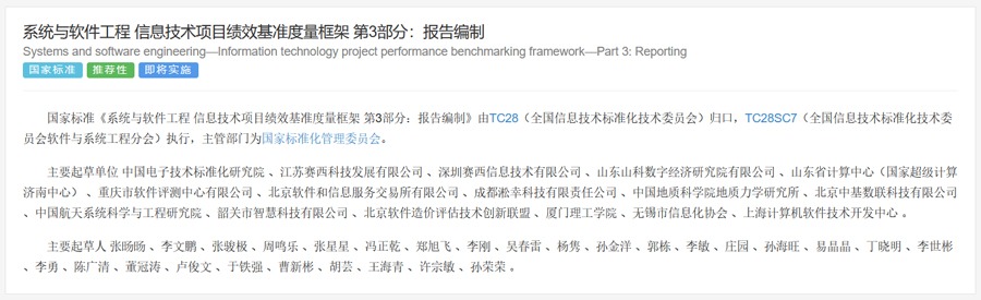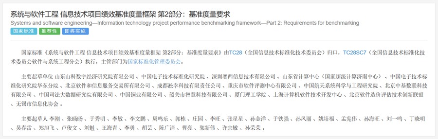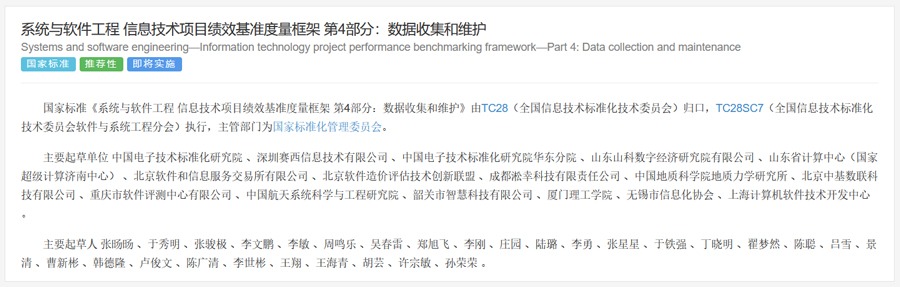该标准由中国计算机用户协会软件造价分会、北京软件造价评估技术创新联盟、北京中基数联科技有限公司、北京科信深度科技有限公司、华测检测认证集团股份有限公司、苏州市软件评测中心有限公司、北京迅威国信科技有限公司、北京尊冠科技有限公司武汉分公司、北京联海信息系统有限公司、云南电网有限责任公司信息中心、湖南新星项目管理有限公司、国家能源集团国际工程咨询有限公司、成方金融信息技术服务有限公司、北京永拓工程咨询股份有限公司共同完成。